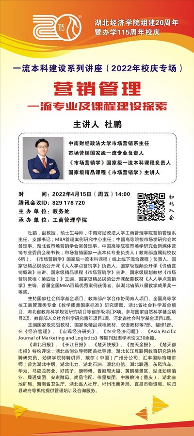 为夯实和推进bat365在线官网登录市场营销国家级一流专业,更加聚焦聚力打造一流本科教育,强化专业课程建设内涵,2022年4月15日,中南财经政法大学市场营销国家一流本科专业负责人、市场营销学国家级一流本科课程负责人、市场营销系主任杜鹏教授透过腾讯会议开展一流专业建设与发展的专题讲座,副院长叶敏、市场营销系、工商管理系、人力资源系、物流管理系教师参加了会议。会议由副院长叶敏主持。